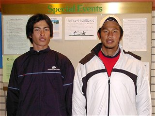 亜細亜大のペア、国吉智規(左)と宮崎靖雄(右)。国吉は昨年の横浜のチャレンジャーで予選を勝ち上がって本戦に出場したので、まだ記憶に新しい。メッチャ強そうなペアだが国吉のダブルスポイントが少ないためシードは付いていない。おかげで2回戦は第1シードの駒田/有本ペアとの対戦となってしまった。