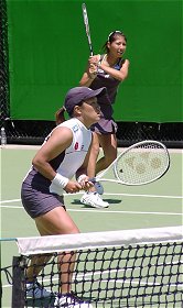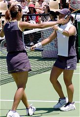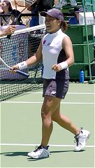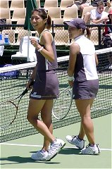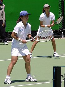 昼過ぎには帰国しなければならなかった昨日は、幸いにも11時から始まる第1試合に浅越しのぶ/藤原里華vsジャネット・リー/ウィーネ・プラクシャの2回戦が組まれた。この試合を見ないで帰国するようなことになったら随分悔いが残っただろう。リー/プラクシャは第16シード、このペアの強さは岐阜のカンガルーカップなどで見たことがあるので、よく承知している。特にプラクシャの可愛い顔からは想像もできない老獪なテクニックは要注意だ。ハードヒット、絶妙のロブ、そんなところを狙うか?というようなアングルショット、油断も隙もない。正直なところ、日本ペアの勝ち目は30%くらいと感じていた。