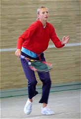 会場は草津から20分ほど下った花敷温泉にある小学校のインドアクレイコートに移った。もちろんスタッフも見たことがない。テニスのライン以外にも他の競技のラインが重なって引かれている、などとまことしやかな噂が流れていた。現地に行ってみると思った以上に立派なコートだった。左右前後の広さは充分、天井も高く少々のロブでは届かない。ただコートは薄緑色のクレイでやや柔らかい。表面の砂の目が粗く、かなりイレギュラーすることが予想された。
