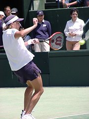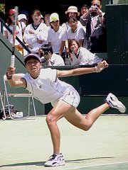 試合を見ながらどんなコメントにしようか思いあぐねていた。なぜならプリンのテニスはあまりに淡白で、しかもプレイスタイルはへなへなとした感じで捕らえどころがない。ネットへ出るでもなく、ストロークが得意というわけでもない。第1セットは浅越のちょっと深いストロークを簡単にミスし、あっさりとセットを失った。この時点では浅越の楽勝かと思われた。