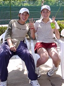 女子は2人とも始めて見る。第1セットはお互いブレークが続き、第11ゲームでついにキープに成功した米村がセットを先取した。うん、なんか変!?いやいや、女子の試合にありがちなブレーク合戦だった。第2セット以降は関口が圧倒した。米村は終始、サービスの不調に悩まされた。試合後は準優勝の米村明子選手とベスト4の平知子選手のワコールペアがクリニックをしてくれた。参加したのは大会のお手伝いをした山梨学院高校テニス部の部員と私だけだ。インターハイ出場を決めたレギュラーに混じってラリーをしてもらった。なんか、すっげ〜場違い!
