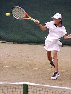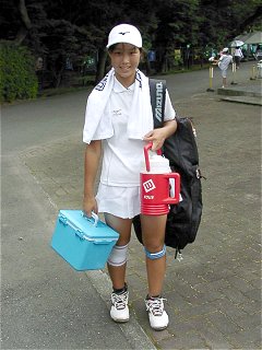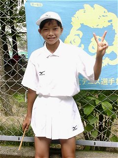 (賢明学院/大阪)関西ジュニアの時、BBSで奈良くるみちゃんより小さい子がいると話題になった。そりゃ、見ないわけにはいかない。うわ〜、ほんまにちっちゃくて、かわゆ〜い!しかし、堂々の第3シードだ。ストロークの当たりが厚く、速いボールにも打ち負けない。カウントもジャッジも大きな声ではきはきとコールする。思わず最後まで見てしまった。危なげなく2回戦突破。