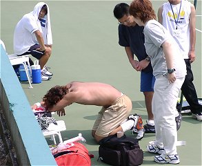 第1シードの李興雨がおかしい。いやいや別に変な趣味があるんじゃなくってえ〜。左は第1セット終了後、腰の調子が悪く治療、右はマッチゲームに入る前、気分が悪いのをがまんしている。試合開始直後こそキャノンサービスを放っていたがみるみる失速、和田の淡白なプレイに助けられてかろうじてフルセットで逆転したが、この先ちょっと不安だ。