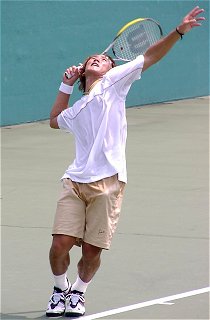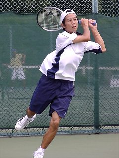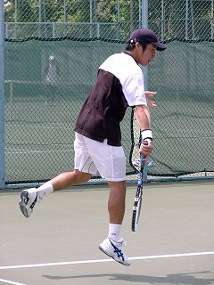 この人を食ったような独特のフォロースルー。影の優勝候補である。できれば黒のウェアはやめて欲しい。だって暗い色のウェアはデジカメのオートフォーカスがうまく働かないんだもの。軽く1回戦突破。