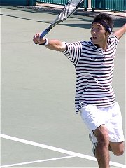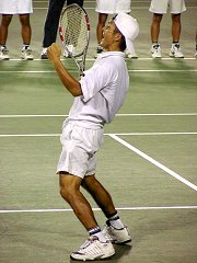 煌々と輝く照明がさらに学生達を高揚させた。逆転で勢いに乗る比嘉が5−2でサービス・フォー・ザ・マッチを迎える。しかし比嘉の足に痙攣がきてしまった。必死で我慢するがなかなか収まらない。たまらず、アンダーサーブ、無常にもフォルト。それでも最後の力を振り絞りネットへ詰める。勝った瞬間、コートに仰向けに倒れ込んでしまった。いい試合だった。