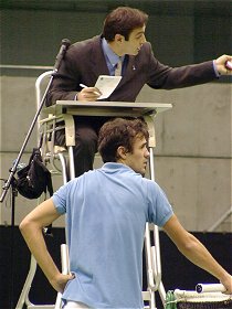 第1セットはリーの調子が出ないまま、ヴァンロッタムが先取した。第2セットはリーも奮起、サービスキープが続いた後のタイブレークで引き離し、セットタイに持ち込んだ。ファイナルセットはリーが先にブレークしたところで俄然面白くなった。ヴァンロッタムが本領を発揮しだしたのだ。ヴァンロッタムの咆えているところを撮ることも今日の私の目標の一つだ。ボールを叩きつけようとしてボールガールをびびらすは、エントランスで騒いでいる子供の声に腹を立て、観客席に向かって「だれか黙らせてくれ!」と叫ぶは、やりたい放題である。しかしワーニングは取られてもポイントを取られるところまではやらない。確信犯だ。ここでGAORAの鍋島さんが「これはいつもの彼のプレースタイルですので、ご安心してください。」と絶妙のアナウンスが入る。