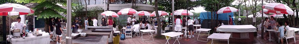 またまた、パノラマだ!ここは観戦者や待機中の選手達がくつろぐクラブの中庭です。左側に売店や、まずい焼きそばを作るレンガ造りの炉があります。今日は、これだけ、スマン!