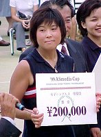 今日は夏空が戻り、観客の出足も上々、蒸し暑さとアズメディア名物のむせ返るような化粧臭さの中で(おい、おい!)、男女シングルスの準決勝と決勝が行なわれました。男子優勝は増田の健ちゃんの2連覇、女子優勝は昨年準優勝の梅原幸恵ちゃんでした。