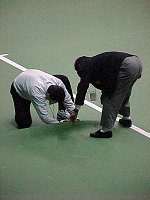 第2試合は増田健太郎vsセバスチャン・フィッツ。増田が 6-4, 3-6, 6-2 でかろうじて振り切った。第3セット、1-4 の崖っぷちからの逆転だ。この試合はジャッジでもめた。クレーコートの性質上、選手はボールマークのチェックを要求できる。チェアアンパイアは大忙しだ。試合終了直前、フィッツのボールが増田のクレームでアウトに判定されていた。試合が終わって引き上げる時、あきらめきれずフィッツが自分でボールマークをチェックした。引き上げようとする増田にフィッツが大声で噛み付いた。「おまえはアウトでないってわかってただろ。マークを見てみろよ!」増田はまったく取り合わなかった。試合後も戦いは続く。