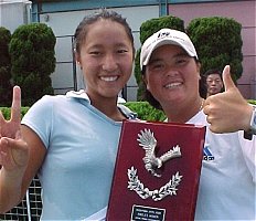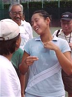 2000年 9月 3日 久我山オープンのシングルス決勝だけを観てきた。今日も快晴であったが風が強く、暑さはそれほどでもなかった。外国人選手だけの決勝であったが、熱心な観客が30人あまり集まった。観戦するスペースが少ないのでちょうどいいくらいかもしれない。 試合のほうは期待以上の激しいストローク戦となった。しばらくJOPの大会を見慣れていた目には、久しぶりに見る国際大会のストロークのスピードは驚くばかりだ。この大会に出場している日本選手の中でも、このスピードについて行ける選手は何人もいないだろう。 決勝に進出した2人の年齢をWTAの公式サイトで調べてみた。トンは19歳、チャンは18歳だ。トンは外国選手としては珍しく左右両手打ち、ひたすらハードヒットする。フォームもプレースタイルもモニカ・セレスに似ている。チャンは特にサービスとフォアハンドが素晴らしいが、今日はこの両方が裏目に出た。昨日もダブルフォルトが多かったが、今日はさらに多かった。しかも風下から打つ得意のフォアハンドは風に勢いを殺され、一発で決まらない。無風であったら、また違う展開になったかもしれない。「たら」を言っても仕方がないが.. トン・カ・ポー(香港) 7-6(3), 7-5 チャン・キュン・ミ(韓国)