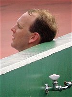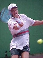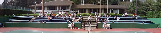 2000年 9月 24日 目が覚めたら9時だった。やばい!遅刻だ。鷹之台オープン、シングルス決勝は11時試合開始だ。あわてて身支度を整え、家を出た。幸いにもみんなオリンピックの女子マラソン中継を見ているせいか、高速道路はがらがらだ。いままでずっと遠いと思っていた鷹之台テニスクラブにはあっという間に1時間半で着いてしまった。おまけに雨が残っていたせいで試合開始が1時間遅れた。時間的には余裕だった。 ルネッサンスの本拠地、鷹之台テニスクラブには一度、行ってみたかった。想像していたより随分立派なテニスクラブだった。ハードコートと砂入り人工芝のコート合わせて18面もある。センターコートは観戦しやすいスタンドが設けられている。周りは林に囲まれて環境もよい。ただし観戦はやぶ蚊の攻撃をもろに食らう。さされるのがいやな方は虫除けは必携だ。 ダブルス決勝は片方のペアがなぜか棄権したため、行なわれたのはシングルス決勝1試合のみだった。最初は子供たちやクラブの人たちが大勢、観戦していてかなりにぎわっていたが、そのうち次第に人が減り、最後にはいつものように40人ほどになってしまった。指導者の方が子供たちにプロの試合を見せようと引率していたようだ。しかし見たところ指導しているのは技術的なところばかりだ。だから少し見たらすぐに引き上げてしまう。 技術的なことも重要だが、もっと大切なのは試合の組み立て方であるとか、有利になったときの試合の進め方、不利になった時の試合の立て直し方、などの創造性ではないだろうか。技術を習得してから、あわてて創造性を養おうとしてもどだい無理だ。創造性は技術以上に日ごろの積み重ねが大切だ。テニスは技と力と創造性を駆使したゲームなのだ。指導者は1試合を通して観戦させ、プレーヤーが何を考え、何をやろうとしていたのかをディスカッションさせる、というような指導も必要だと思う。<そんなこと教えられる指導者がいないって? シングルス決勝は前週の柏に続き、また外国選手同士の組合せとなった。しかも2人ともオーストラリアの選手だ。国内の大会で決勝に日本選手が残れないのは本当に残念だ。ホームの有利さを生かしてどんどんポイントを稼がなければならない。ホーランドはランキング526位、グッディングは800位だ。2人のプレイを見ても、決して飛びぬけているという印象はない。日本選手はいつでも同じステージに立てると思う。来週は川口で最後のマスターズがあるが、日本選手の奮起を促したい。 レイ・ホーランド(豪) 6-3, 0-6, 7-5 ジェイ・グッディング(豪)