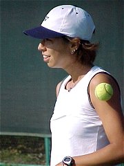 大体予想通りの展開になった。一昨日の試合ぶりから見て、飯島はまだ田口には勝てないだろうと思っていた。田口のいいところは勝とうが負けようが、いつも自分のテニスを貫き通すところだ。フォア、バックとも両手打ちでひたすらハードヒットする。ほとんど小細工はしない。フラットドライブからムーンボールまで、スピンの量を調節して変化をつけるぐらいだ。相手のボールが甘くなると思い切り叩き込む。あれだけ思い切りひっぱたければさぞかし気持ち良いだろうな、と思わせる爽快感がある。 もっと上を狙うならば、もう一つ武器が欲しい。私はサービスを改良することが手っ取り早いと思う。今でもかなり速いサービスが打てるのだが、トスが少し手前のせいか窮屈そうに見える。今日もダブルフォルトからリズムを乱し、何度かサービスゲームを落とした。もう少しトスを前にするだけでボールに体重が乗り、さらに攻撃的なサービスを打つことができる。サービスで崩して、少しでも前で叩き込めばプレイの幅がぐんと広がるだろう。 一方の飯島はいろんなことをやり過ぎた。田口に合わせてムーンボールで応酬したり、ドロップショットを打ったり。特に、追いつめられた時のドロップショットはいただけない。金がない時にギャンブルをやるようなものだ。ますます借金が増えていく。貧乏人はギャンブルをやってはいけない。若いのだから、もっと思いっ切り打ち合って欲しかった。 岡本 聖子(フリー) 5-4(5), 4-0, 1-4, 5-3 郡司 亜希子(ワコール)