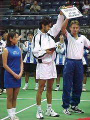 2000年 11月 4日 横浜チャレンジャー第6日、主催者のもくろみは恐らく、もろくも崩れ去ってしまったに違いない。本村剛一も李享澤もそろって負けたからだ。日曜日の決勝はノウル対タイノという日本では全く無名選手の対戦になってしまった。しかし何もがっかりすることはない。無名であろうがゲームの質が下がるわけではない。強いものが勝ち残っただけだ。明日も間違いなく熱戦が期待できる。ぜひとも足を運んでいただきたい。 [ 今日の結果 ] J.ノウル(オーストリア) 6-2, 6-2 本村 剛一