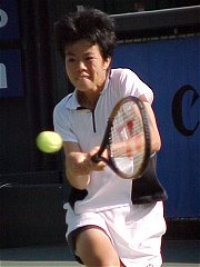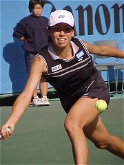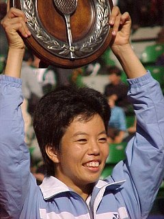 2000年 11月 10日 全日本テニス選手権第5日、休暇を取って観戦に来た。昨日は随分寒かったようだ。今日はそれほどではないが、少し冷え込む。第3試合の途中から小雨がぱらつき、センターコートの屋根は締められた。外のコートは近隣住民との申し合わせで11月以降は照明がつけられない。暗くなったら続行不能となる。今日は女子ダブルス準々決勝の1試合が1セットオールとなったところで、翌日に持ち越された。もう少し雨にたたられれば週末のテレビ中継にも影響が出るかも知れない。スケジュールに関してはまさに綱渡り状態の大会である。 今日は藤原里華、梅原幸恵、近藤大生、3人の試合に注目した。ご覧のように3試合とも判で押したように同じようなスコアになってしまった。 女子シングルス準決勝 井上 青香 6-3, 6-2 藤原 里華