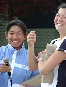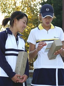 ダブルス決勝 岡本 聖子/田口 景子 3-5, 4-1, 5-4(4), 4-1 新井 由樹/飯島 久美子 昨年の決勝と3人まで、同じメンバーとなった。昨年、新井は高校の先輩の手塚怜美と組んで出場した。岡本/田口ペアに大逆転を喰らい、試合後号泣していたのが初々しかった。今年は学校こそ違うがいつも組んでいる飯島とだ。第1セットは歯車がかみ合って、先取した。しかし第2セットから岡本/田口ペアが巧さを発揮した。若い高校生ペアが勢い込んでネットへ詰めると、面白いようにロブが頭の上を抜けていった。