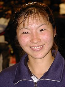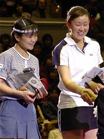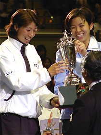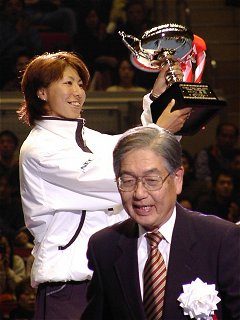 2000年 12月 23日 けたたましい目覚ましの音で目が覚めた。そうだ、今日はイザワクリスマスオープンに梅ちゃんの応援に行くのだった。寝ぼけ眼を擦りながら、手早く着替えて家を出る。まだ外は暗い。ゴルフに行くおじさん、夜通し遊んでいた若者、早朝にもかかわらず電車は意外に乗客が多い。新横浜6時16分発のぞみ1号に飛び乗った。私の頭の中には山下達郎のメロディが流れていた。♪きっと君は来ない〜..ウォオ〜、サイレンナイ〜 女子シングルス決勝の模様はテレビで放映されたので見られた方も多いと思う。息の詰まるような素晴らしい接戦だった。梅ちゃんは、全日本の準決勝で4ゲームしか獲れなかったにもかかわらず「手ごたえを感じた。」という自らの言葉を証明して見せた。 女子シングルス決勝 浅越 しのぶ 6-4, 5-7, 7-5 梅原 幸恵
