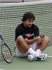 ネットにラケットを立てかけ、パームトップらしきもを楽しそうにいじっているイリー、何かめちゃ不自然。それもそのはず、試合の合間を利用したCMの録画取りのようだった。