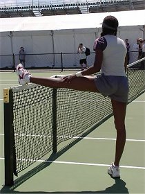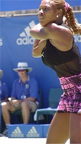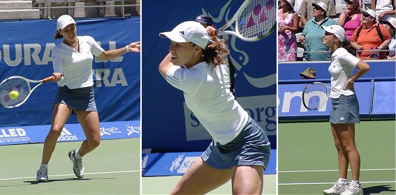 2001年 1月 11日 アディダス国際 第5日 朝から快晴、肌を刺すような太陽がじりじりと照りつけた。東京と赤道をはさんで緯度はほぼ同じ、何でこんなにさわやかさが違うのだろう。東京は熱帯のような粘りつくような暑さ、かたやシドニーは標高が低いにもかかわらず高原のさわやかさ、まったく不思議で不公平だ。 アディダス国際観戦も2日目、会場スタッフの行動パターンも次第に読めてきた。「ここはどこ?私はだれ?」作戦はここでも通用することがわかった。というわけで今日は至近距離からマルチナのショットをたくさん撮った。試合のほうはマルチナがコートカバリングの良さを発揮して、セリーナをストレートセットで破った。最後はセリーナが根気負けした感じだ。モニカとのダブルスは残念ながらマルチナ/モニカ組が棄権してしまい観られなかった。モレスモー戦の時、モニカがメディカルタイムを取っていたので、たぶん大事をとったのだろう。 ![]()