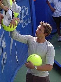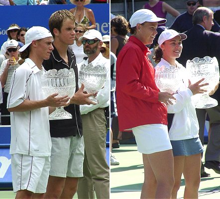2001年 1月 14日 アディダス国際 第7日(最終日) シングルス優勝は地元のレイトン・ヒューイットとマルチナ・ヒンギス、スポンサーにとっては理想的な結末となった。優勝カップのプレゼンターにシドニーオリンピック競泳の英雄イアン・ソープが現れ、会場の興奮は最高潮に達した。アディダスはさぞかし溜飲を下げただろう。 女子シングルスの決勝はスリルに満ちた展開となった。1セットオール後の第3セット、常にダベンポートが先行しヒンギスが追いかける形になった。ヒンギスは決してあきらめることなく、辛抱強くダベンポートのボールを拾った。そして信じられないようなダベンポートのスマッシュミスを誘うなど、じわじわと挽回していった。開幕戦でセリーナとダベンポートを連破し、全豪オープンに向けて十分期待を抱かせる結果となった。 ![]()