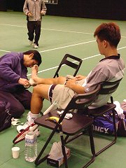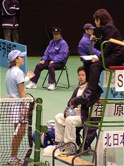 2001年 2月 10日 日本リーグ準決勝 日本リーグ決勝は2ブロックに分けられた予選リーグの各ブロック上位2チーム、合計4チームでトーナメントが行なわれる。1日目の今日は準決勝、2日目の明日は3位決定戦と決勝が行なわれる。実業団の日本一を決定する大会だ。 午前10時から女子準決勝、北日本物産対荏原、ワコール対朝日生命が同時に行なわれた。シングルス1と2が同時に開始し、そのあとでダブルスが行なわれる。北日本物産はシングルス1の藤原里華、シングルス2の堀田朋愛が順当に勝ち、早々と決勝進出を決めた。ワコール対朝日生命の対戦はシングルス1勝1敗となったあと、勝敗はダブルスに持ち込まれた。このダブルスがもつれにもつれた。第3セットはタイブレークに突入、ワコールの石塚/平ペアは最初のマッチポイントを逃したあと、朝日生命の高橋/石川ペアに3つのマッチポイントを獲られるが、これを凌ぎに凌いで決勝進出を決めた。高橋/石川ペアはマッチポイントを握った時、攻められなかったのが悔やまれた。紙一重の勝負だった。