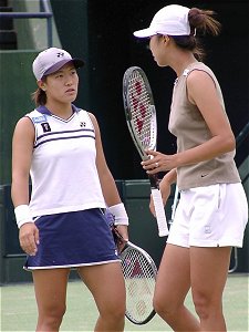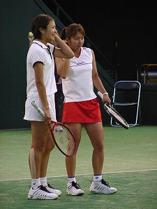 さおりんと友佳ちゃんのフェド杯コンビ。魔の5−2と言う言葉は草テニスでもプロでも一緒、最終セットまくられてしまった。ほとんど流れは日本ペアだったのになあ..