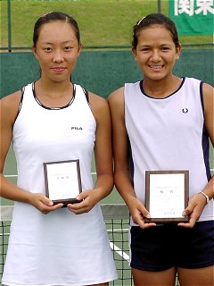 16歳以下シングルス優勝、朝日生命JTCの瀬間友里加(右)と準優勝、朝日生命久我山SCの萩本愛里(左)。予想通り、瀬間はずば抜けた強さを発揮して優勝した。将来が楽しみである。この2人はダブルスでも一緒に組んで優勝。