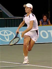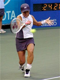 2001年 9月 18日 トヨタプリンセスカップ 本選第2日 オーダーオブプレイを見たら杉山愛のシングルスがNB15:30、続いて藤原里華の試合が組まれていた。と言うことは里華ちゃんの試合は17時ごろに始まるということだ。しめた。15時ごろ早退すれば何とか見られる。理由は何とでも適当につけよう。ついでに里華ちゃんファンの友人を誘ってみた。友人は歯医者に出かけたということにした。長い歯医者やね。 しかしチケットは1枚しかない。1試合だけ観るために2500円を払うのはもったいない。そうだ、きっと早めに帰る人がいるに違いない。チケットの半券をねだろう。まず歩道橋の上でおばちゃん2人組に声をかけた。ところがどうやらダフ屋に間違われたらしく、そそくさと逃げられてしまった。歩道橋の階段を下りるとコロシアムから続々とお客さんが出てくるのが見えた。ちょうど愛ちゃんの試合が終わったようだ。これだけ人がいれば心配なし。今度は警戒されないように満面の笑顔を作ってご夫婦に声をかけた。快く半券を譲ってくださった。やった〜 会場に入るとグッドタイミング、里華ちゃんとカラ・ブラックが入場してきた。さて、今日最後の課題をクリアしなければならない。やはりコートサイドで観なければ..ところが今日はコートサイドの降り口でスタッフがチケットをチェックしているではないか。席はがらがらなのに、せこいやつらめ。仕方なしに自由席に腰を下ろした。