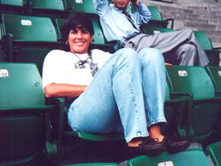 ヘンリエッタ!なんて格好してんの! すらりと伸びた足がきれいな長身のヘンリエッタ・ナギョワちゃんです。残念ながら今日は沢松選手の粘りにあって逆転負けを食らってしまいました。試合後シャワーを浴びて選手席で観戦しているところです。負けた後だったのでちょっと気が引けましたがにっこり笑ってくれました。 |
