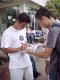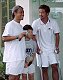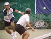 増田くんは前日に続いて、安藤将之選手に6−3、6−1の完勝、余裕の勝利でした。もう一方の準決勝で、アクシデント。山本くんと対戦中の辻野くんが左足首をねんざし、リタイアしてしまいました。かなりの重傷で、倒れてからしばらくトレーナーが来るまで、自力で動くこともできませんでした。6−0、2−1と圧倒的にリードしていたので無念だったでしょう。辻野くんの華麗なネットプレーを楽しみにしていたのにあまり観られなくてがっかりでした。(後ほど、辻野くんの怪我は骨折と判明) 突然、現れたシューゾーくんに場内は騒然となりました。間近に見ると、さすがに背が高く、さっそうとしています。テレビのコメントを収録していましたが、相変わらずの松岡節、まじめにやってんだか、受けを狙ってんだか、わからないようなところが特徴です。ダブルスの写真は石井弘樹くんと古庄大二郎くんです。プロのダブルスを観ていると信じられないような素晴らしいプレーの連続で、ぜひ一度観て欲しいと思います。 |