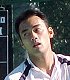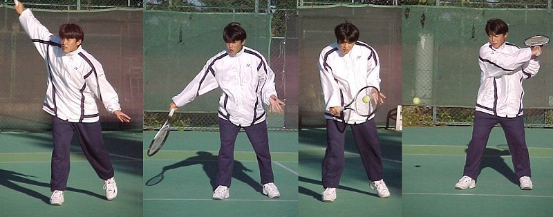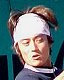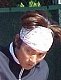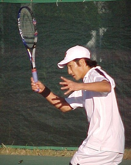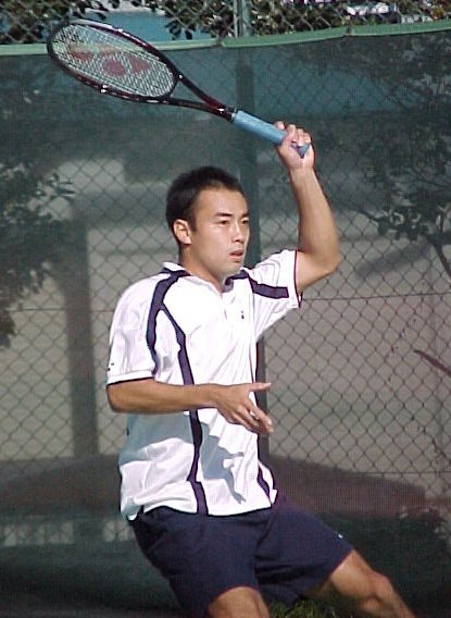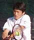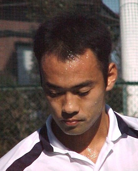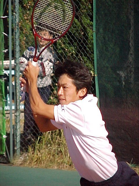 シングルス準決勝ではブチくんに 3-6,6-3,6-2 で惜敗の寺地くんです。どうもフルセットになるとスタミナ切れで、分が悪いようです。でもさすがに人気者、コギャルの追っかけが何人か観戦していました。 |