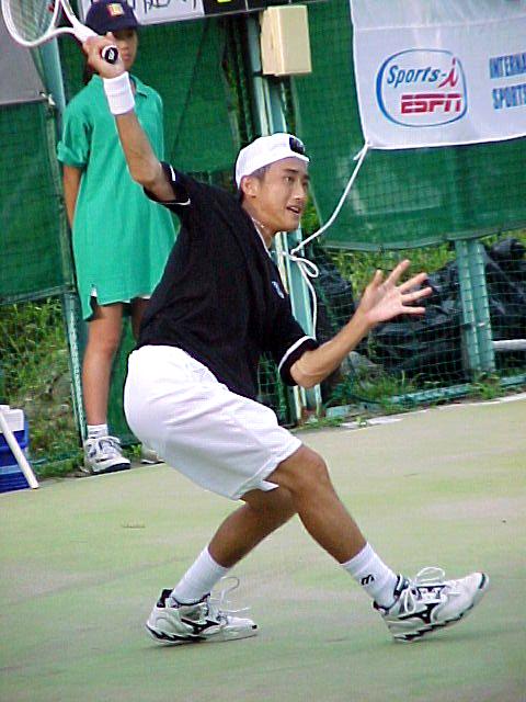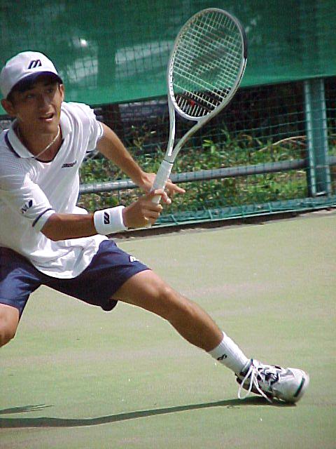 試合は序盤から激しい打ち合い、寺地くんは健ちゃんに対して真っ向勝負を挑みました。寺地くんは、今までになくハードヒットしますが、健ちゃんはまったく動ぜず、深くて重い球を右に左に自在に打ち分けます。寺地くんのポジションが次第に後退、じわじわとスタミナを奪われていきます。こうなったらもう完全に健ちゃんのペース、最後は寺地くんが第2セット途中で右ひざを傷めてギブアップ、健ちゃんのTKO勝ちとなりました。あっけない幕切れで、あまり写真を撮るひまもありませんでした。