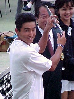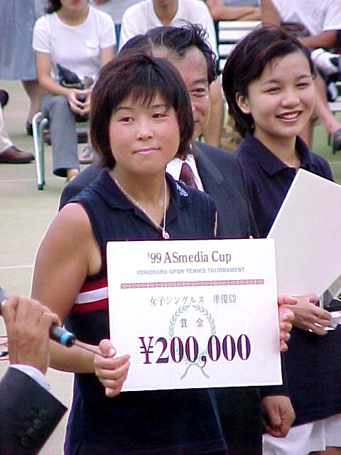 女子決勝は第2シードの宮内美澄ちゃんを破った梅原幸恵ちゃんとノーシードから勝ちあがった竹村りょうこちゃんの間で争われました。二人の試合ははじめて観るので、興味しんしんでした。試合は2時間を越す大接戦、1セットオール後の第3セット、4−4から梅ちゃん(みんなそう呼んでた)がブレークに成功。その後、一転してブレーク合戦、梅ちゃん6−5で、そのままタイブレーク突入かと思われた第12ゲーム、りょうこちゃんのボレーがきわどくアウトしてゲームセット。りょうこちゃんが入っていたのではとアピールしましたが、判定は翻りませんでした。