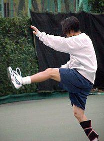 金子くんの練習前の準備運動。見ているとプロのテニス選手というのは準備運動にしっかり時間をかけます。私らのように準備運動嫌いの、練習嫌い、すぐゲームなんていうのはもってのほかです。