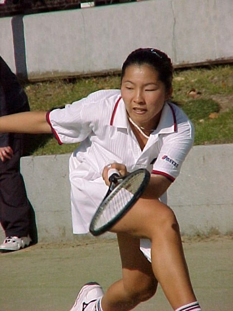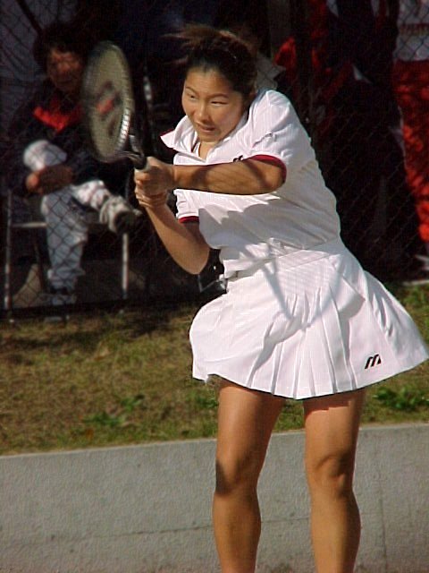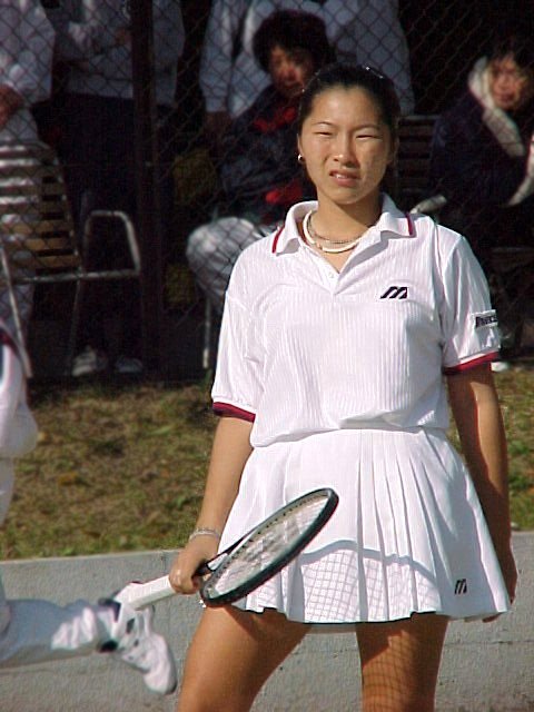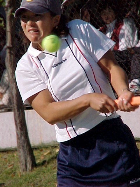 第1セット第1ゲーム、梅ちゃんのサービスを礼美ちゃんがいきなりブレーク。と思ったら梅ちゃん第2ゲームをすぐさまブレークバックして、第3ゲームでやっとキープ、2−1。そのあと第4ゲームから第6ゲームまでブレーク合戦。第7ゲーム梅ちゃん、再びサービスキープして5−2。ところが、ここから礼美ちゃんが反撃に転じ、2ゲーム連取。梅ちゃん、だんだんいらついてラインジャッジのミスに噛みつきます。明らかなアウトボールを見逃したラインジャッジをにらみつけ「メチャ、アウトや〜ん!」この時は主審がオーバーコール。5−4となりましたが、次のゲームをブレークして、第1セット先取。