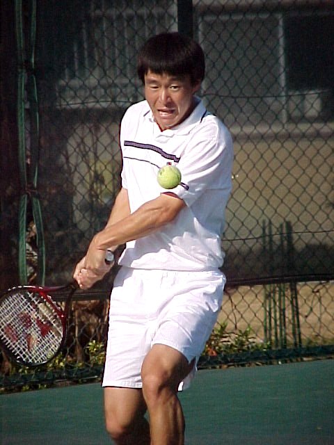 第1セットいきなり權くんが2ブレークの3−0、福ちゃんは苦しい立ち上がりとなりました。福ちゃん第6ゲームで始めてブレークし2−4。このあとスライスを織り交ぜ、權くんを撹乱、4−4とします。次のサービスゲームをキープし、ついに逆転して5−4。このころから權くん、福ちゃんのバックを執拗に攻めます。この作戦が功をせいし、第1セットは7−5で權くんが先取しました。