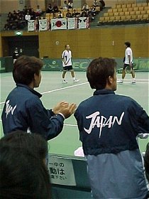 第1セットは途中1ゲームずつブレークしてタイブレークへ、韓国が先取。第2セットに入っても日本チームは硬さがとれず、ミスしないでもいいようななんでもないボールをミス、1ブレークを許しこのセットも失います。第3セット、韓国の第1サーブでは2人ともうしろへ下がり守備陣形でのぞみます。トミーの気合も次第に入ってきて、ようやくセットをものにします。