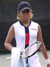 井上青香に敗れ、さえない表情の森上亜希子。途中で手首を痛めてしまった。