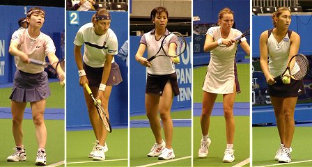森上の足首に巻いたサポータが痛々しい。昨年痛めた怪我が完治していないようだ。最近の調子を見るかぎり久松の方が有利かと思われた。第1セットは久松が予想通り圧倒した。森上は時折、足を引きずり苦しそうだ。第2セットに入ると不思議なことに森上のストロークが正確になってきた。いつもならふかすようなボールが久松のコート深く突き刺さった。 第3セットに入っても流れは変わらなかった。足首も温まって痛みも和らいだのだろうか、次第に森上の動きが良くなっていった。気がついたらあれよという間に逆転勝ちしていた。 |