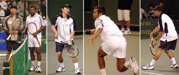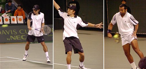 勝2敗の日本、もうあとがない。いよいよ鈴木貴男とレアンダー・パエスのエース対決だ。4月2日付ランキングは鈴木が155位、パエスが274位、男子の場合、この差は誤差のようなものだ。パエスのシングルスを見るのもはじめてだった。 |