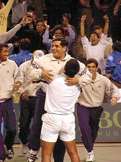 最終セット第4ゲームで鈴木はパエスの一瞬の隙をついて先にブレークに成功する。ところが次のゲームがいけなかった。サービスゲームであるにもかかわらず守りに入ってしまった。すぐにブレークバックされ、嫌な雰囲気だ。そして決定的な第9ゲームがやってきた。鈴木は40−0とリードしながら、逆転で落としてしまう。ネットに詰めてきた鈴木のわきを、パエスのパスが面白いように抜けていった。最後はこの試合を象徴するように鈴木のロブがサイドを割って、4時間を越える熱闘に終止符を打った。 試合は昨日のダブルスと同じような展開になった。昨日は惜しかったと書いたが、今日はあえて書かない。なぜならこの試合は鈴木にとって、日本のエースとして勝たなければならない試合だったからだ。惜しいという言葉がいかに虚しいか、痛感しているのは鈴木本人だろう。 |