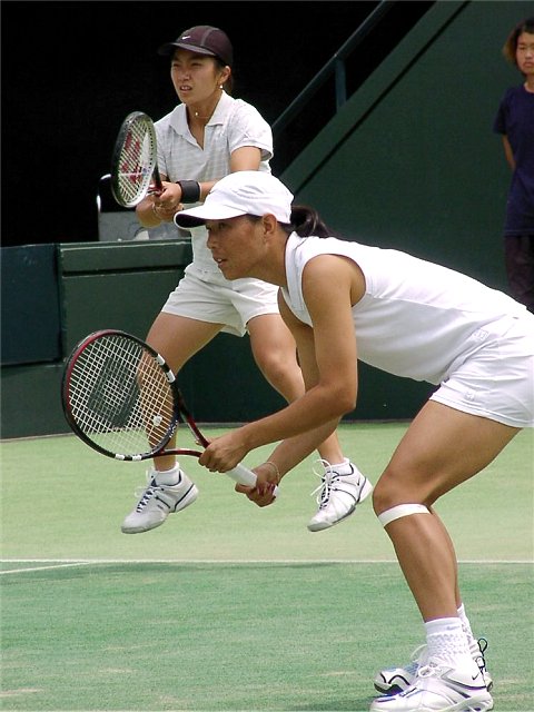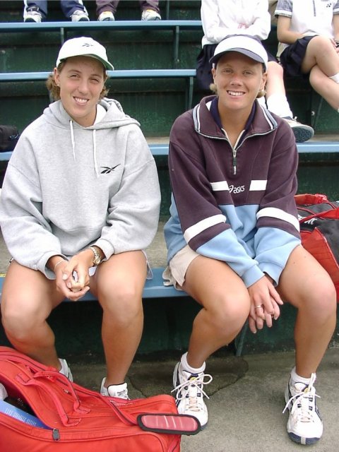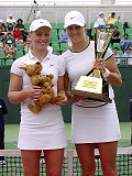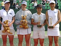 最初は押され気味だったアジアペアがじわじわと挽回し、最後は大接戦になった。今大会のプラクシャ/キム組の粘りはとにかく凄い。1Rが7−5,5−7,6−4、準々決勝が3−6,7−6,7−6、準決勝は4−6,6−4,7−6である。これはもう、神がかりと言うほかない。目立ったのは一番小柄なプラクシャの芸術的なトップスピンロブとアングルショットが随所で効果を上げた。 |
